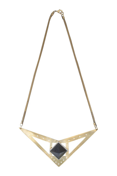 Vintage lace is used to imprint a delicate texture on the brass pendant. Choose from Black tourmaline (pictured), Amethyst or Clear Quartz pyramid. Brass snake chain & clasp.